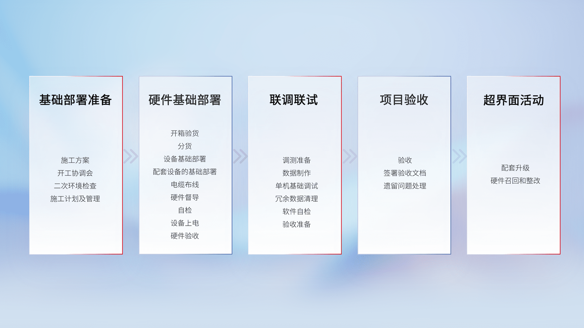 从基础部署准备、、硬件基础部署、、、联调联试、、项目验收、、越界面活动的全过程可追溯,,保证施工质量和进度。。。。